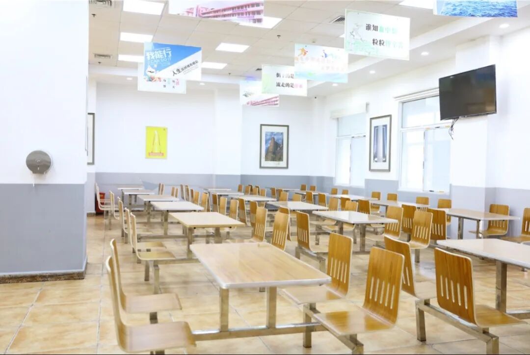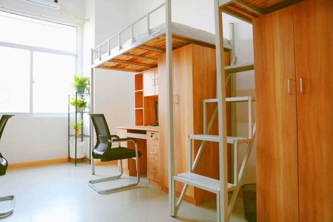 学校住宿楼与食堂共处同一栋楼(节省就餐步行时间),电梯直达各楼层,宿舍区含盥洗间、卫生间、淋浴间、四人间宿舍配备有衣柜、穿衣镜、写字桌、靠椅等。